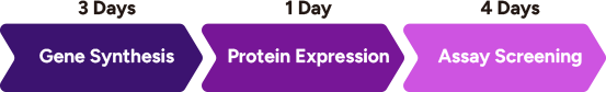 • E. coli: Enables higher-yield expression for robust validation and future scale-up. 500 samples/day (4mL) with a 1-2 week turnaround.