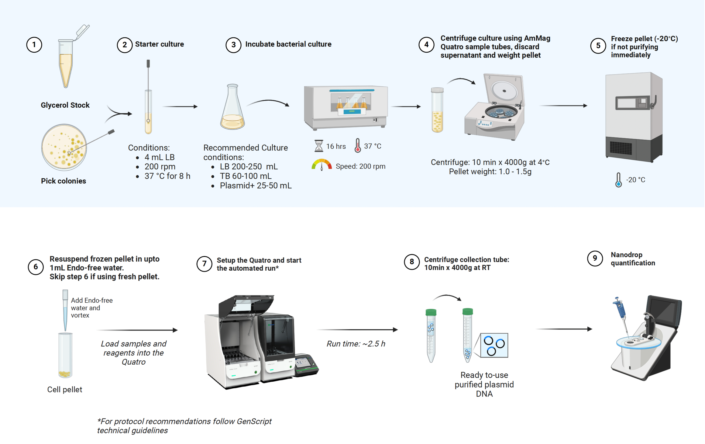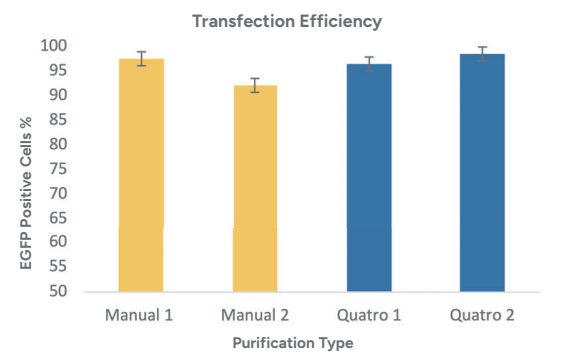 Test results show the AmMag™ Quatro solution yields equivalent amount of purified plasmid to a manual kit with high quality and low endotoxin levels.