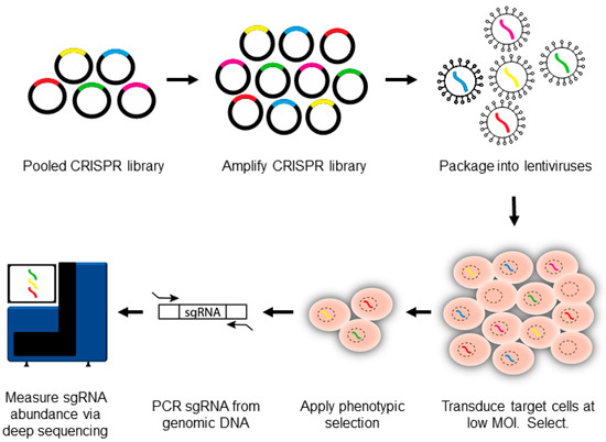 How CRISPR/Cas9 sgRNA pooled libraries work for in vitro screening. “Single-guide RNA (sgRNA) libraries are initially synthesized as lentiviral vectors and are then amplified and packaged into lentiviruses. The lentiviral vector encodes an sgRNA and a selectable marker, typically puromycin.” “Lentivirus pools are then used to transduce Cas9+ target cells at low multiplicity of infection (MOI). A low MOI is used to avoid coinfection by multiple lentiviruses. A positive or negative selection pressure is used to identify cells with a desired phenotype. The genomic DNA is extracted from input versus selected cell pools, and the integrated sgRNA sequences are PCR-amplified. The sgRNA abundance is then determined by next-generation sequencing.” Diagram and Legend, retrieved with minor modification from Gebre et al. 2018.3 http://creativecommons.org/licenses/by/4.0/