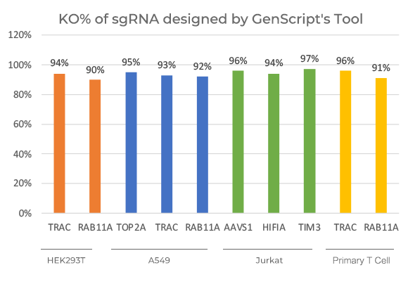 GenScript EasyEdit sgRNA achieved >80% KO efficiency for all three gene targets tested, comparable to other vendors. sgRNAs were designed for 3 randomly selected gene targets (Seq_1, Seq_2, Seq_3), and KO efficiency of sgRNAs from different vendors were examined in Jurkat cells.